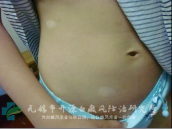 ▲现病史:患者发现腹部白斑3个月左右,曾在省内医院治疗过,中药、外用药、口服药都用过,白斑还有扩散现象,今来就诊。