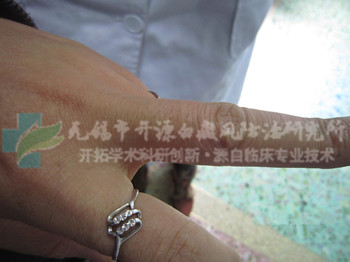 【治疗前,手指白斑面积较小,属于发展期白癜风】